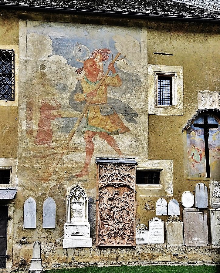 Dafür waren die Gegebenheiten extrem günstig, denn nach der Legenda aurea wäre der heilige, watende Fährmann zwischen 6 m und 9, 6 m groß gewesen. Dementsprechend riesig konnte man ihn auch darstellen – in den Kirchen selbst, vor allem aber an deren Außenwänden, sodass man ihn und das Christuskind auch von weiter entfernten Wegen aus sehen kann. Allein in meiner Heimat Kärnten gibt es über 500 solcher Außenfresken. Ich bringe ein Beispiel von einer prominenten Kärntner Kirche, dem „Dom“ von Maria Saal.