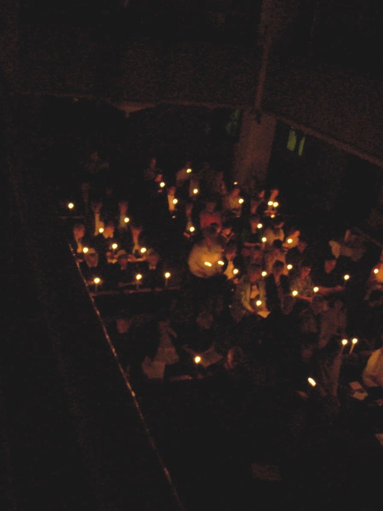 An dem brennenden Stoß wird dann die Osterkerze entzündet und in die völlig dunkle Kirche getragen.