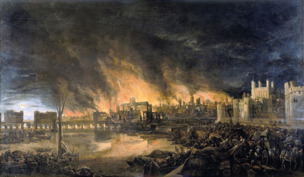 Und wenn Unbelebtes „im Feuer steht“, dann tritt mir als erstes das „Große Feuer von London“ aus dem Jahr 1666 vor Augen, das vier Fünftel der City of London zerstörte und etwa 100.000 Einwohner obdachlos machte.
