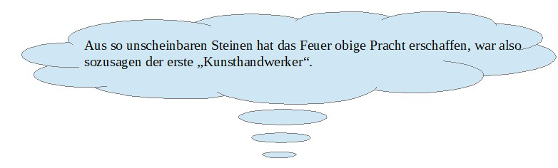 Aber natürlich geht die „Wohltätigkeit“ des Feuers weit über ein solches Beispiel hinaus, denn wenn das Rad die wohl wichtigste Erfindung des Urmenschen war, so war das Feuer gewiss seine wichtigste Entdeckung, als es ihm gelungen war, die Glut, die ein Blitzschlag in einem dürren Geäst hinterlassen hatte, zu bewahren (und später natürlich aus dem Feuerstein Funken zu schlagen). So wurde Zivilisation überhaupt erst möglich. Und im Anschluss daran auch immer mehr Kunst, angefangen vom schwarzen Ruß der Holzkohle, geeignet für zeichnerische Umrisse, gefüllt mit verschiedenen aus der Natur gewonnenen Farben, sodass wir nach Jahrzehntausenden noch die genialen Ergebnisse der Höhlenmalerei in Ehrfurcht bestaunen können.