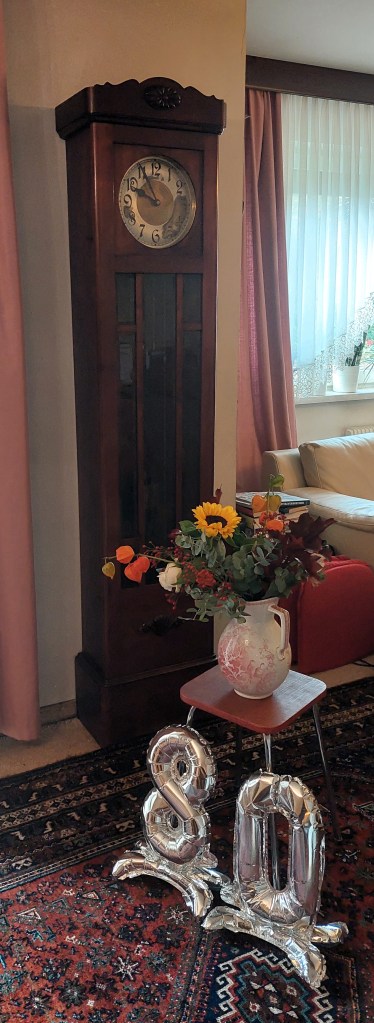 Nochmals STOP! Die Folien-Ballon-Zahl versprüht ja silbernen Glanz! Und den beziehe ich nicht auf meinen eisgrauen Bart, sondern er macht mich „übermütig-demütig“ (verrückte spontane Wortschöpfung von mir) im Sinne von Ingeborg Bachmanns Gedichtzeilen (der Todestag der berühmten Dichterin fiel übrigens genau auf meinen 30. Geburtstag): „…Vom hohen Trapez im Zirkuszelt spring ich durch den Feuerreifen der Welt! Und gebe mich in die Hand meines HERRN. Und ER schickt mir gnädig den Abendstern.“