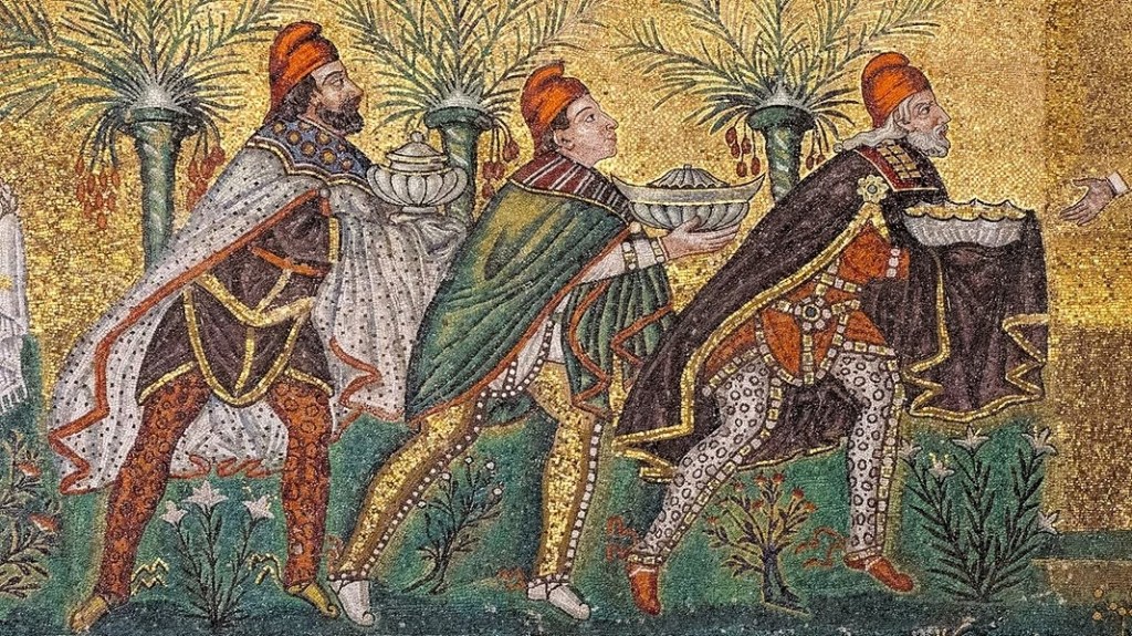 Und genau das zeigt uns noch das byzantinische Mosaik in Sant‘ Apollinare Nuovo in Ravenna. Die sogenannten phrygischen Mützen signalisieren, dass die Herrschaften aus dem Osten kommen, denn sie wurde ursprünglich von anatolischen Völkern getragen. Später wurde sie charakteristisch für die Perser und Thraker.