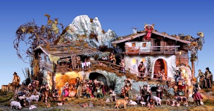 Hier eine Krippe aus dem für seine Schnitzereien weltberühmten Südtiroler Grödnertal. Hinten der Dolomitenberg Langkofel. Diese Kostbarkeit kostet die Kleinigkeit von 9.900 €.