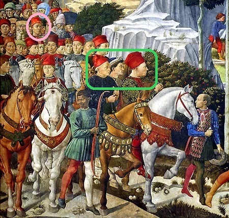 Hinter ihm reiten ebenfalls drei Mediceer, die ich grün eingekreist habe: