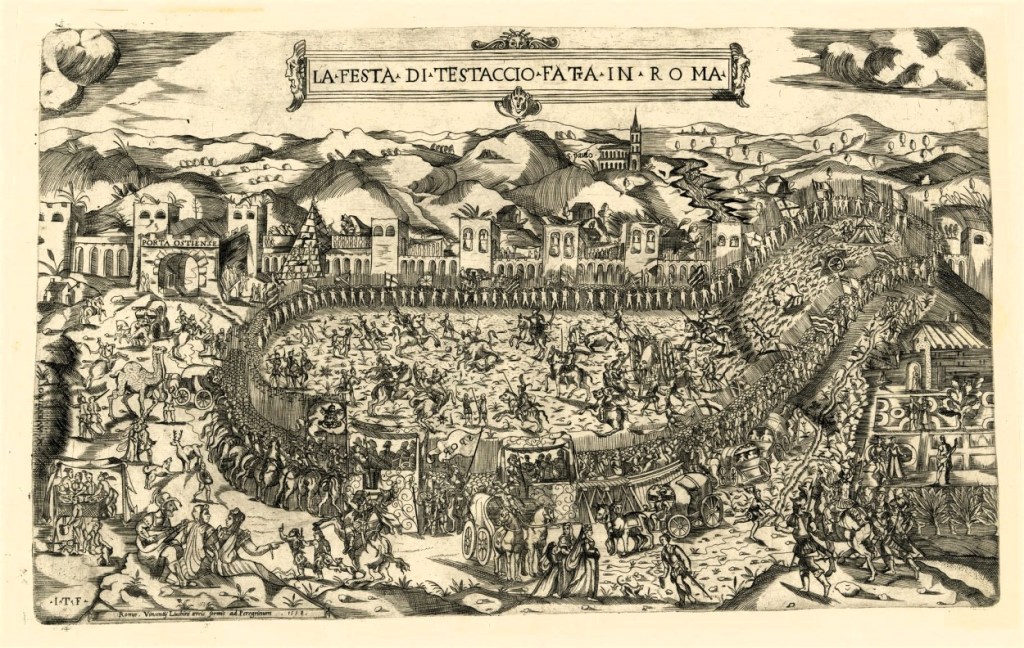 Zu dieser damals bereits überwachsenen Erhebung bewegte sich nun vom Kapitol aus ein Festzug mit prächtigen und fantasievollen Kostümen und später auch mit Wägen mit allegorischen Darstellungen. Auch der Papst ritt in Begleitung des städtischen Adels zu den wiedererweckten, wohl in vielem aber auch erfindungsreich neu adaptierten Spielen. Geboten wurden Duelle, Turniere, Stierkämpfe und andere Tierhatzen, bei denen neben jungen Stieren auch ein Bär und ein Hahn getötet wurden. Eine Radierung von 1558 vermittelt uns einen ungefähren Eindruck davon, was hier los war.