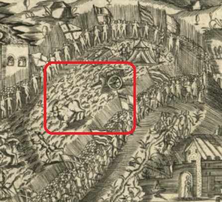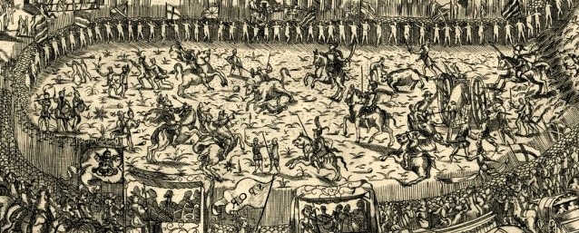Am Fuß des Hügels war eher ordinäres Volk versammelt, das sich um das Fleisch, das von den Schweinen übrig geblieben war, raufte, sich aber gleichzeitig gegen die jungen Stiere wehren musste, die ja nun, nachdem der Karren zerschellt war, frei geworden waren. Dass die Kirche nichts gegen eine solche aus der Antike ererbte Brutalität gegen Tiere einzuwenden hatte, wurzelte in der Anschauung, dass das Töten der Tiere die Befreiung von Sünden symbolisiere.