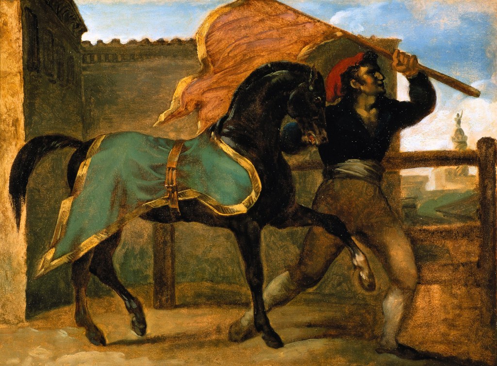 Wir haben nicht nur das Glück, einen schreibenden Goethe als Korrespondenten vor Ort zu haben, sondern auch einen Bildberichterstatter. Es hatte sich nämlich gerade auch der bedeutende französischen Maler Théodore Géricault zu einer Italienreise entschlossen, die ihn auch nach Rom führte. Und wie es der Zufall so will, war er überdies ein ausgemachter Pferdenarr. Daher wohnte auch er 1817 dem karnevalesken Pferderennen bei, von dem er fasziniert war.