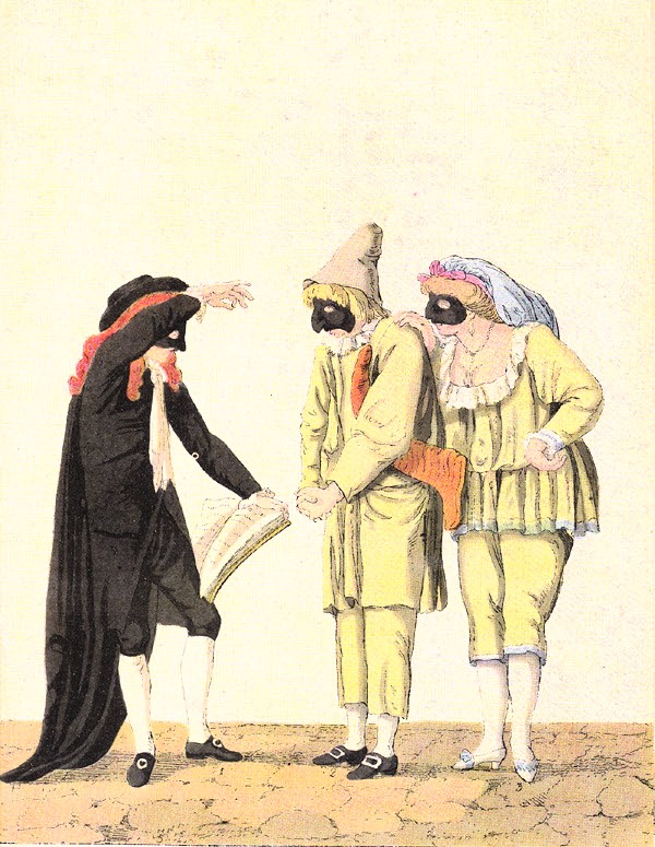 Zuerst kommen „junge Männer, geputzt in Festtagskleidern der Weiber aus deren unterster Klasse … Sie liebkosen die ihnen begegnenden Männer, tun vertraut mit den Weibern als mit ihresgleichen, treiben sonst, was ihnen Laune, Witz oder Unart eingeben.“ Soweit Goethe, der dann ergänzt, „dass die Frauen ebensoviel Lust haben, sich in Mannskleidern zu zeigen, als die Männer sich in Frauenkleidern sehen zu lassen“, so verkleiden sie sich gerne als Pulcinella und Goethe bestätigt, dass sie oft „in dieser Zwittergestalt höchst reizend sind“.