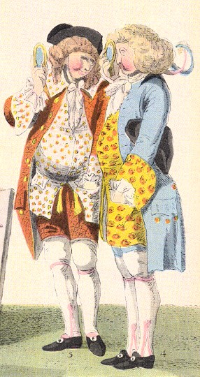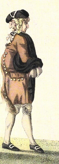 Sie sind in altfränkische Tracht gekleidet, dickleibig, pausbäckig und mit kleinen Schweinsäuglein. Von ihren Perücken hängen wunderliche Zöpfchen. Sie stellen läppische, verliebte und betrogene Toren dar. Es sind ihrer gegen hundert, ebensoviele wie Pulcinellen, und sie laufen den Korso auf und ab.