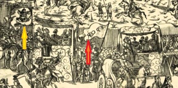 Neben der linken prangt eine Standarte mit dem päpstlichen Wappen, einer Tiara vor den gekreuzten Schlüsseln des Apostel Petrus. Siehe: gelber Pfeil. Rechts weht eine Fahne mit der (hier seitenverkehrten) Abkürzung S.P.Q.R., dem antiken Kürzel für das Hoheitszeichen Roms, aufgelöst in: Senatus Populusque Romanus, „Senat und Volk von Rom“ (roter Pfeil).