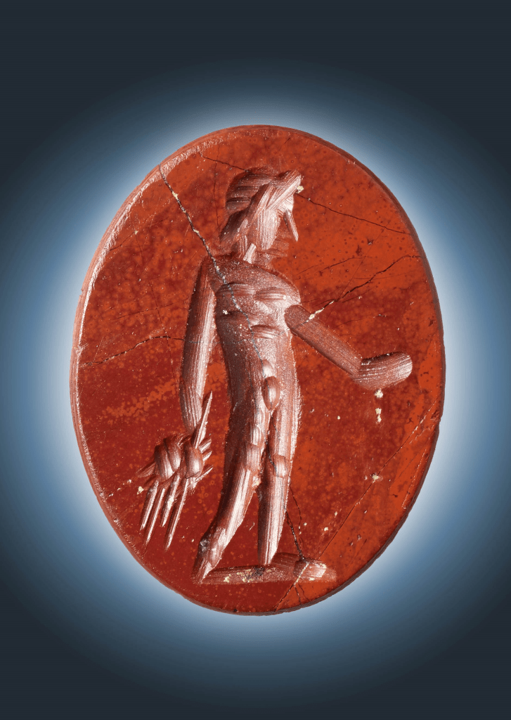 Zigaina beschloss, sich in der nahen Stadt Aquileia auf die Suche nach einem einzigartigen Geschenk zu machen, das am besten so groß und zugleich so schlicht sein sollte, dass sie es wie ein Schmuckstück tragen könnte. Die Stadt wird heute vor allem von Touristen aufgesucht wegen ihrer wunderbaren Basilika aus dem 11. Jahrhundert (UNESCO-Welterbe), die über einem frühchristlichen Mosaikboden steht, der seinesgleichen suchen kann. In der Antike aber war Aquileia die viertgrößte Stadt des römischen Reiches gewesen. Daher hatte Zigaina hier auch ab und zu Wünschelrutengänger auf den nassen Feldern gesehen, die hofften, auf Antiquitäten zu stoßen. Insbesondere schwemmte der Regen auch immer wieder Karneole, die von antiken Schmuckstücken stammten, an die Oberfläche. Zigaina konnte eine solche Gemme tatsächlich erwerben, die sogar das Bild eines Gottes, Jupiter oder Merkur, trug. Sie wird eventuell so ähnlich ausgesehen haben, wie dieses Fundstück aus Aachen: