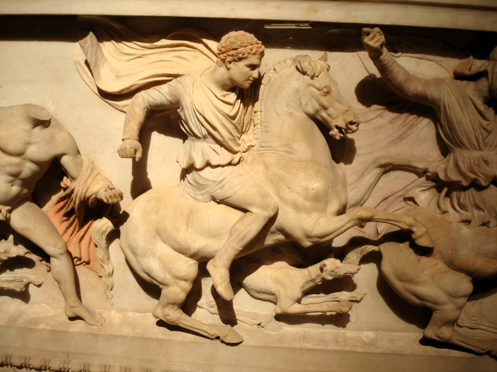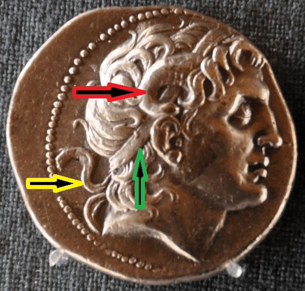 Und so diente es beispielsweise sogar einem Alexander dem Großen als Herrschaftszeichen. Sehr schön zu sehen auf dem „Alexandersarkophag“ und auf Münzen, bei denen auch noch die dem Band beigefügten Ammonshörner zu sehen sind.
