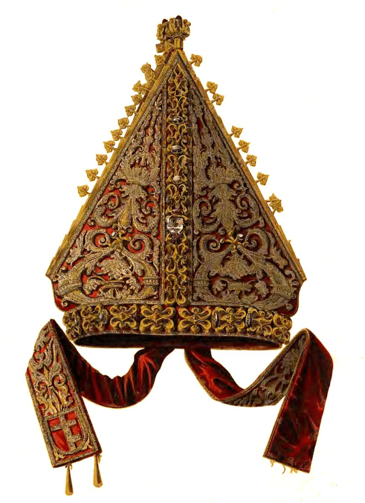 Der gelbe Pfeil der obigen Abbildung verweist auf ein geknotetes Band. Es ist eine Reminiszenz an das ursprünglich geknotete, textile Siegerband der Athleten. Und auch diese Verknotung mit den herabhängenden Enden erwies sich bis zum heutigen Tag als ungemein zählebig. Denn die Stirnbinde war nicht nur, wie soeben gezeigt, verbunden mit weltlicher Macht, sondern auch mit geistlich-religiöser. Auch die antiken römischen Priester und Vestalinnen trugen nämlich bei Kulthandlungen eine in weiß und scharlachrot gestreifte oder ganz scharlachrote Kopfbinde aus Wolle. Diese hieß lateinisch infula. Der Ausdruck kommt uns doch irgendwie bekannt vor. Natürlich, denn so nennt man bis heute die beiden von der Bischofmütze herabhängenden Bänder. Und ein anderes Wort für die rituelle Kopfbedeckung diözesaner Oberhirten ist „Mitra“, was auf altgriechisch wiederum nichts anderes bedeutet als „Stirnbinde“.