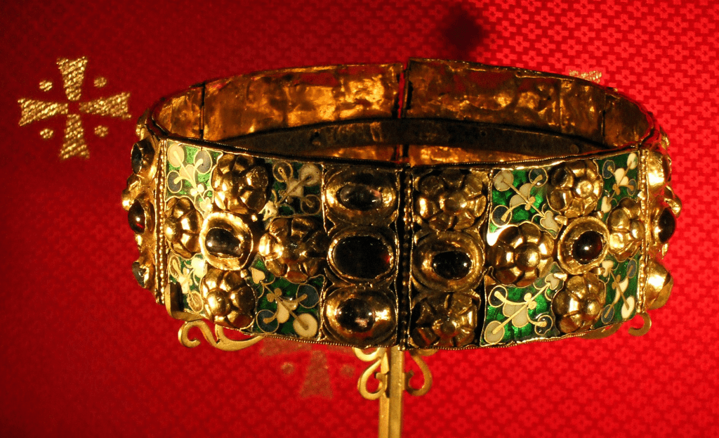 Eine frühe weltliche Krone würde ich noch gerne präsentieren, weil sie so beispielhaft für die Ringform ist. Es ist die berühmte „Eiserne Krone“ der Langobardenherrscher, die in Monza aufbewahrt wird. Sie besteht aus einem sechsteiligen, grün-emaillierten und mit 22 Edelsteinen besetzten unregelmäßig runden Goldreif. Die Platten werden innen von einem Metallring zusammengehalten. Früher glaubte man, dieser sei aus einem Kreuzesnagel Christi geschmiedet worden, was moderne Analysen jedoch widerlegen konnten. Diese bestätigten anderseits, dass einzelne Bestandteile bereits um 450/500 und um 800 entstanden sind. Das würde tatsächlich eine Anfertigung bereits in der Völkerwanderungszeit, also zur Zeit der Langobarden bestätigen.