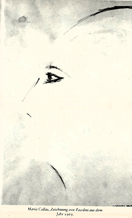 Pasolini malt auch wieder. Schon 1969 hat er in Grado und Cervignano eine Porträtserie von der Sängerin während der Dreharbeiten zu „Medea“ angefertigt, sowie ebenfalls eine anlässlich eines gemeinsamen Urlaubs auf der griechischen Insel Skorpios. Anfangs waren die von ihm erstellten Profile auch echte Studien für Filmaufnahmen – für Nahaufnahmen oder sogar extreme Nahaufnahmen. Diese Porträts waren demnach auch funktional für den Film, Material für die Annäherung an die Hauptfigur, wobei die Callas meist überhaupt nicht amused war, dass ihre große griechische Nase – von der Pier Paolo allerdings sehr begeistert war – so sehr in Szene gesetzt wurde. Nun verfertigte der Künstler während des Urlaubs auf Tragonisi noch eine weitere Porträtserie.