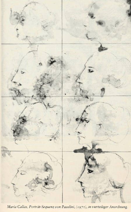 … Nach vollendeter Arbeit faltet Pasolini das große Blatt zweimal von oben nach unten, dann, um die Felder voneinander abzugrenzen, von rechts nach links, so dass die gezeichneten Profile der Callas einige Augenblicke in das Gemisch der belebenden Säfte getaucht werden; beim Wiederentfalten des Blattes scheint er eine nicht nur formale Entdeckung, fast eine Regeneration zu erwarten. Die Blütenblätter, der Saft der Traubenkerne und der Hauch Rotwein scheinen mit ihren ungebräuchlichen Farben der Starrheit des Profils Lebendigkeit zu verleihen. Doch nur einige Augenblicke lang, denn durch die Oxydation der Materialien wird in kurzer Zeit aller Glanz zerstört; und schließlich bleiben nur noch der Schweiß, die Fäulnis und Unbeweglichkeit des Todes.“ Zigaina erinnert auch daran, dass die geschilderten Verwandlungsstufen an die Alchemie erinnern, an der Pasolini sehr interessiert war, ebenso wie an verwandte Themen beim Psychologen C.G. Jung und beim Religionswissenschaftler Mircea Eliade.