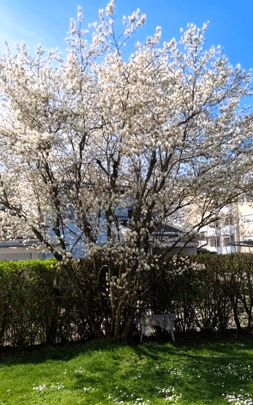 Dieses Bild zeigt die Felsenbirne in unserem Garten im weißen Blütenschnee am heurigen 7. April – sehr früh wegen der vorsommerlichen Hitzewelle. Und was sehe ich heute, 16 Tage [!] später?