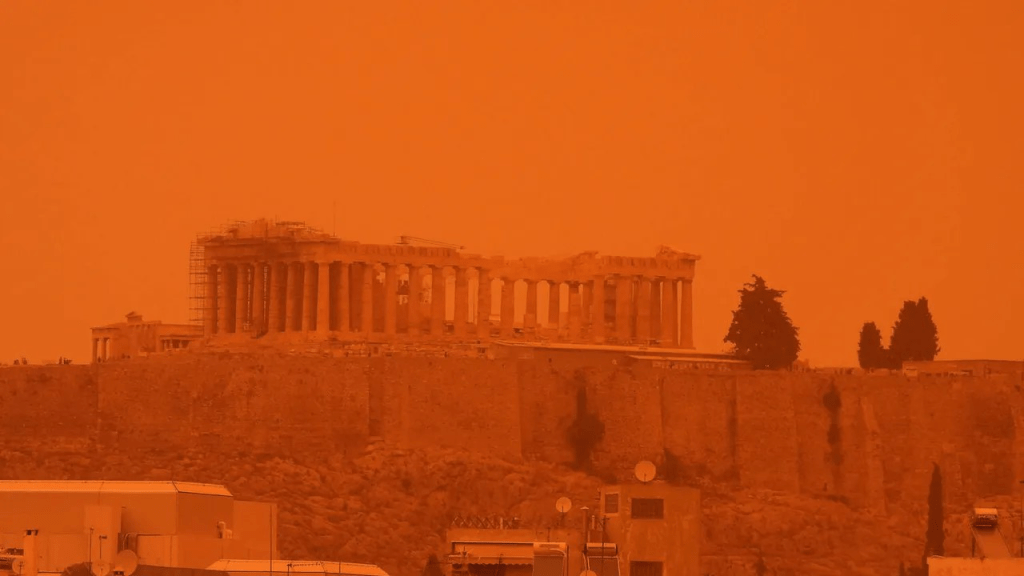 Gottvater exkulpierte und lobte sie gleichzeitig: „Es sei euch verziehen, denn ihr habt wirklich Wackeres geleistet, wie ich ja auch allen von mir verfolgten Zeitungsberichten und Nachrichtenvideos entnehmen konnte. Ich rechne euch übrigens auch noch hoch an, dass ihr mit eurer „Express-Luftpost“ Sahara-Staub um die halbe Welt exportieren ließt, in einer Quantität wie nie zuvor, was die betroffenen Menschen sehr irritiert hat, gilt das Phänomen doch auch gesundheitsschädlich für Allergiker und Personen, die an Atemwegserkrankungen leiden. Ich prophezeie übrigens, dass es am 23. April beispielsweise in Athen so aussehen wird: