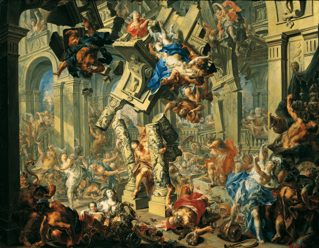 Er war der Schrecken der Philister, die mein Volk Israel so sehr bedrängten. Gar viele von ihnen hatte er erschlagen und wäre weiterhin unbesiegbar geblieben, hätte ihn nicht das korrupte Weib Dalilah an seine Feinde verraten. Sie schnitt dem scheinbar Geliebten im Schlaf das Haupthaar, an das seine Kraft gebunden war, die somit dahin war. Ich habe ihm damals aber für einige ausreichende Augenblicke noch einmal seine Riesenstärke zurückgegeben, auf dass er sich rächen konnte durch das Einreißen der Säulen des Tempels der Philister, von denen er Tausende in den Tod mitnahm.