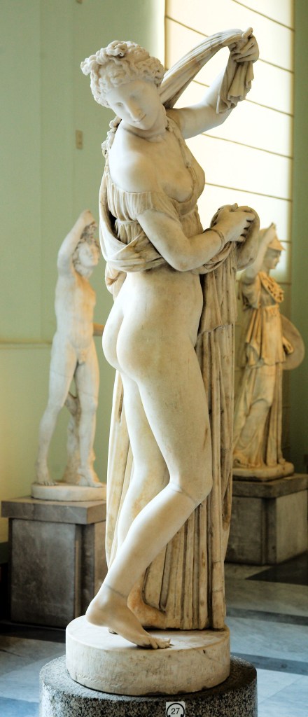 Dann wandte er sich Frau Venus zu. Im relativ wenig gedämpften Tageslicht – sie stand dem Perlvorhang am nächsten – traten die Blessuren der jüngsten Vergangenheit gnadenlos hervor, hatte er sie nackt doch nur im nächtlichen erotischen Flackern der Kerzen im zypriotischen Boudoir erblickt, und ein paarmal bei Mondenschein am Meeresstrand. Auch warfen Fettpölsterchen kleine Schatten auf die Haut der Liebesgöttin, geschuldet der ach so köstlichen aber fettreichen Hausmannskost aus der Küche der Mutter und Großmutter des Anchises. Auch war der Gesamteindruck etwas schlapp und schlampig.