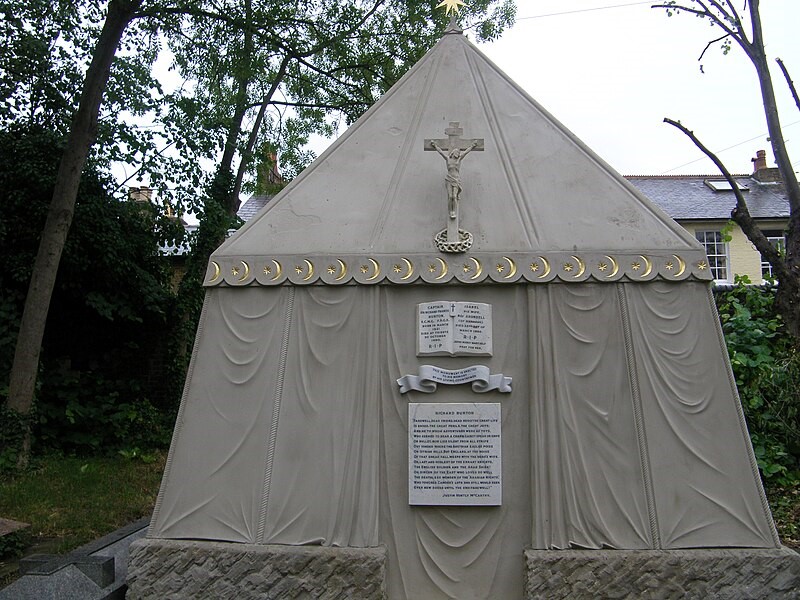 Da es in der Zwischenzeit noch etwas kühler geworden war, und es in der Laube nach versengten Dornen stank, lud mich Jehova mit einem jovialen6 Lächeln in seinen mit vulkanischer Fernwärme geheizten Palast in Form eines Beduinenzelts, d.h. ähnlich geformt wie das Londoner Grabmal von Richard Burton – nein, natürlich nicht des Filmschauspielers, sondern des gleichnamigen britischen Afrikaforschers, Offiziers, Konsuls, Übersetzers, Orientalisten und Mitglieds der Royal Geographical Society.