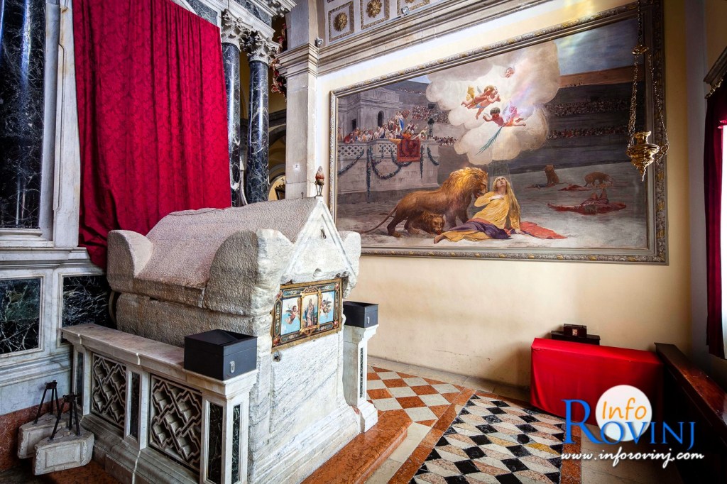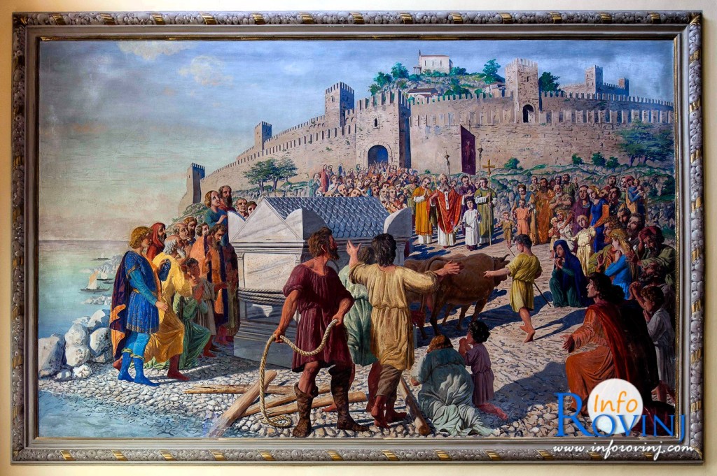 Reliquien von ihr „tingelten“ in halb Europa herum, bis sich endlich jene Legende konkretisierte, nach der ihr Leichnam in einem riesigen Steinsarkophag in Rovinj angeschwemmt und von einem Knaben unter Mithilfe zweier Rinder an Land gezogen worden sein soll. (Stein schwimmt ja bekanntlich hervorragend, wovon sich ja wohl auch die Redensart ableitet, eine Person sei „untergegangen wie ein Stein“ – LOL. Aber, wie sagte schon Goethe: „Das Wunder ist des Glaubens liebstes Kind“. )
