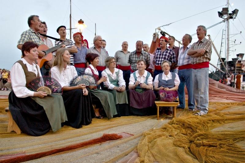 Und mit ihr ist auch ein in Rovinj sehr lebendig gepflegter italienischer Volksgesang verbunden, die Bitinada. Wer möchte, kann sich nun (unter https://www.youtube.com/watch?v=x8ixRsp1XDY) zur Entspannung ein Stück anhören, mit gleichzeitiger Aussicht auf den Rovinjer Kai. Der Überlieferung nach entstand dieser Gesang durch die einheimischen Fischer, die stundenlang in ihren Booten saßen und mit dem Fischfang oder mit der Ausbesserung ihrer Netze beschäftigt waren. Weil sie dabei die Hände nicht für Musikinstrumente frei hatten, entstand dieser besondere Gesang, bei der einige Sänger Musikinstrumente mit ihrer Stimme imitieren. So ist eine originelle Art der vokalen Solistenbegleitung durch die Nachahmung von Instrumenten entstanden. Sobald der Solist ein Lied anstimmt, nutzen die "bitinadùri" (so heißen die 15 oder mehr Sänger) all ihre Stimmkünste um ein imaginäres Orchester nachzuahmen. Eine Wiederholung einzelner Vorführungen kann meist nicht stattfinden, weil sie improvisiert wurden.