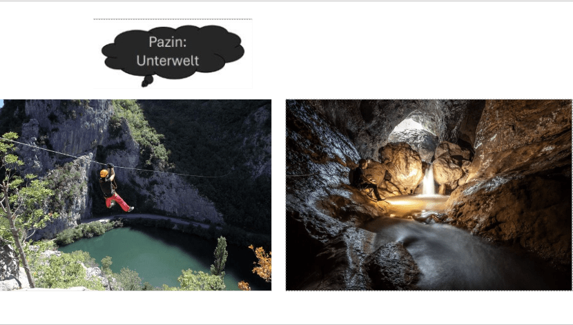 Vom weiten Horizont des Meeres muss ich jetzt freilich noch einmal unter die Erde zurückkehren, zur Karsthöhle von Pazin, Dantes fiktives Höllentor, denn ich hatte früher deren ganz große Besonderheit noch nicht erwähnt. Hier verschwindet nämlich der dortige Fluss Pazinčica. Da kann man an einem Seil vorbeischweben, oder direkt sich in die Höhle begeben.