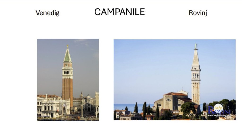 Denn sogar noch 1680 bekommt Rovinj einen weithin sichtbaren Stempel Venedigs aufgedrückt, den Glockenturm der Kirche Sancta Euphemia, der eindeutig bis auf kleinere Details dem Original auf dem Markusplatz der Serenissima nachgebildet wurde.