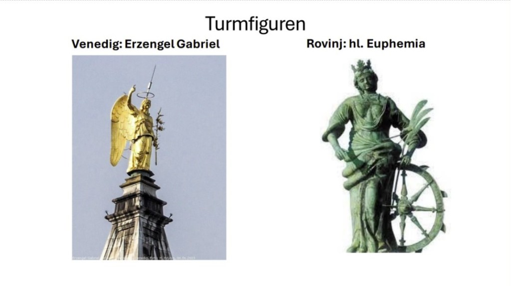 Etwas unterscheidet jedoch die beiden Campanile entscheidend: der in Venedig ist von einer Statue des Erzengel Gabriel bekrönt, in Rovinj – ja, man höre und staune – von einer Frau, wofür ich kein weiteres Beispiel kenne. Darum werde ich versuchen, so kurz wie möglich auf diese Besonderheit einzugehen, obwohl Details unzählige Seiten in Anspruch nehmen würden.