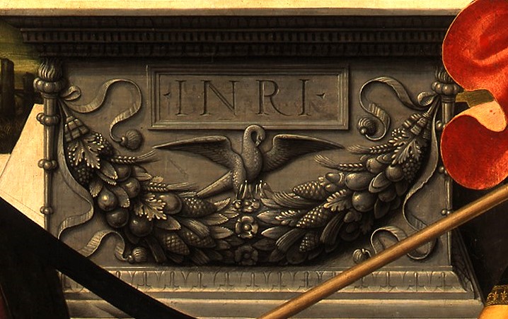 Unter dem Kreuzestitel „INRI“ sehen wir als Christussymbol einen Pelikan, der sich die Brust aufreißt, um seine Jungen mit seinem Blut zu ernähren. Kreuzestod und Eucharistie also.