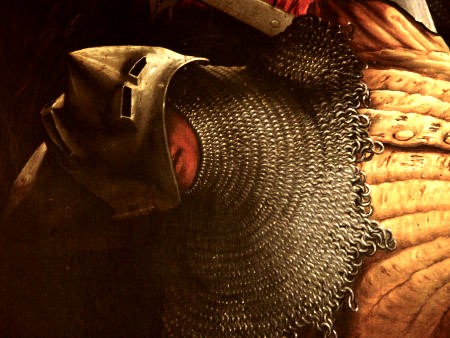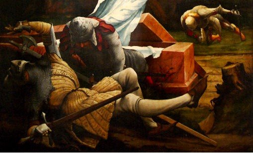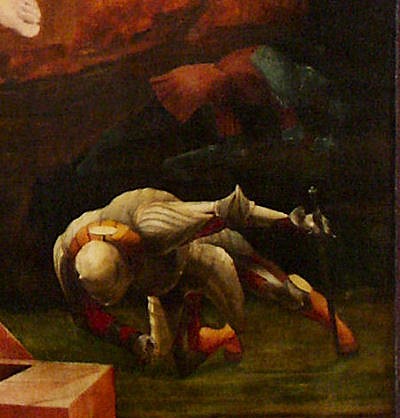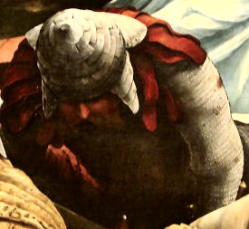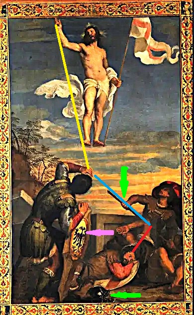 Ich beginne mit der rechten Hand Christi, die auf den Vater im Himmel zeigt, bedeutend, dass von diesem alles ausgeht. Mit einer gelben Linie verbinde ich diese Hand Gottes mit der Linken des Doppeladler-Schildträgers. Von dem geht eine blauen Linie parallel zur Lanze des Wächters rechts außen (auch erster grüner Pfeil), die sich wieder mit dem linken Ellbogen des ganz nach hinten gebeugten Soldaten (zweiter von rechts) schneidet und mit einer roten Linie zum zweiten Schläfer führt. Der erwähnte erste Schläfer weist mit seiner geöffneten, über die Augen gelegten Hand eindeutig auf den Doppeladler hin (rosa Pfeil). Warum weise ich mit dem unteren grünen Pfeil auf den am unteren Bildrand liegenden schwarzen Helm? Weil Karl V. als Reiter von Mühlheim einen ähnlichen trägt, ebenso wie eine Lanze, wie sie dem erwachten Rechtsaußen beigegeben ist. Könnte Tizian hier noch einmal die Absicht gehabt haben, Hinweise auf Karl V. und seine Rechtgläubigkeit zu platzieren (nicht zu vergessen, dass wir uns in der Zeit der beginnenden Reformation befinden, in der sich der Kaiser zum Katholizismus bekannte. Leider ist es mir nicht gelungen, den Schild, den der vordere Schläfer halb verdeckt, zuzuordnen. Vielleicht hätte das noch weitere Aufschlüsse zur Folge gehabt. Auf jeden Fall dürfte es im Interesse der Bruderschaft gelegen gewesen sein, auf dem Bild zu zeigen, dass alle (vor allem auch mit ihrer Hilfe) ebenso wie die rauen Soldaten einen Weg zum „Auferstandenen“ finden könnten. Aber wie gesagt, all das sollte nur ein gedankliches Experiment sein __ und ich habe auch schon die passende Überleitung.