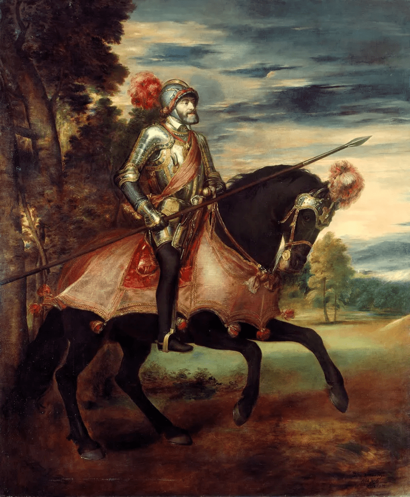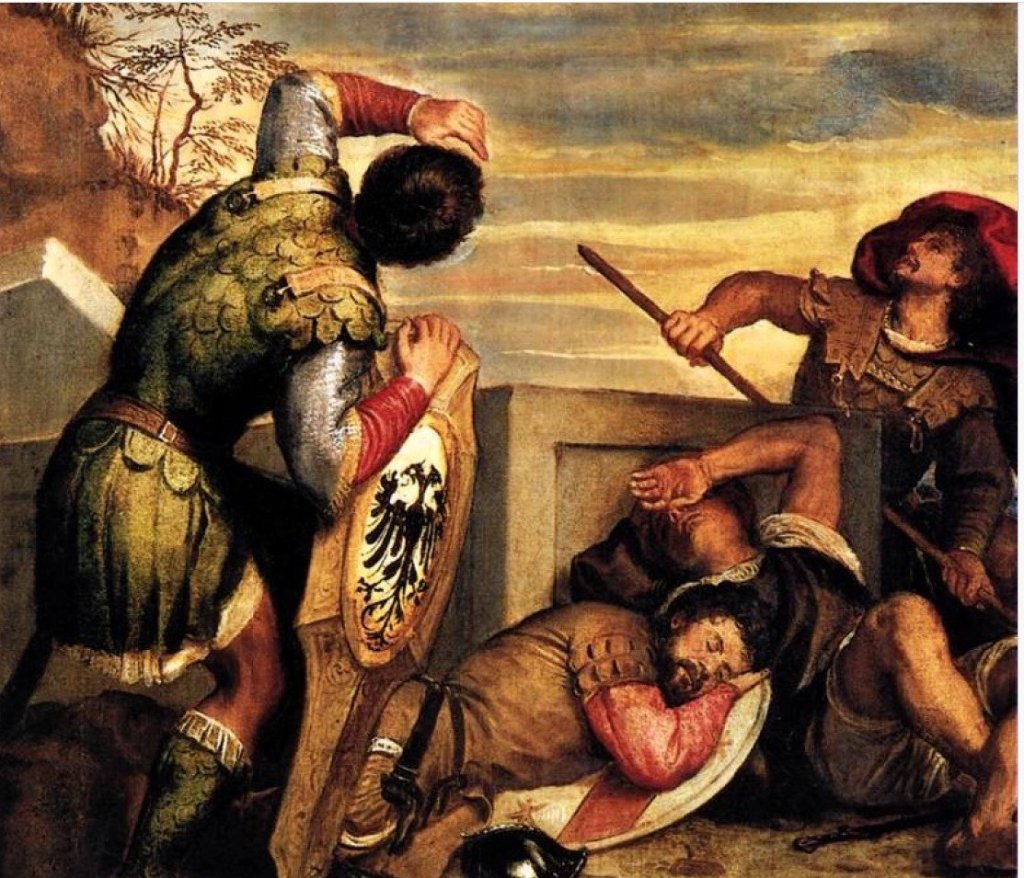 Wir dürfen nicht aus den Augen lassen, das es eine geistliche Bruderschaft war, die Tizian den Auftrag für die sogenannte „Standarte“ erteilte. Der Doppeladler auf dem Wächterschild könnte nicht nur ein Hinweis auf Urbino als Standort der Fraternitas gedacht sein (umso eher, als dafür eigentlich der einfache Adler eher geeignet gewesen wäre), er könnte meines Erachtens auch irgendwie mit dem damals regierenden Kaiser Karl V. zu tun haben, der natürlich ebenfalls den imperialen Reichsadler führte, und zwar natürlich den Doppeladler. Es sollte vielleicht hier darauf hingewiesen werden, dass Tizian als Maler ein enges Verhältnis zu Karl pflegte. Stammt doch von ihm u.a. das berühmte Reiterbild des Imperators nach der Schlacht von Mühlheim, oder das im Schloss Ambras befindliche Halbbild des Kaisers im Harnisch, sowie etwa sein Bildnis im Lehnstuhl.