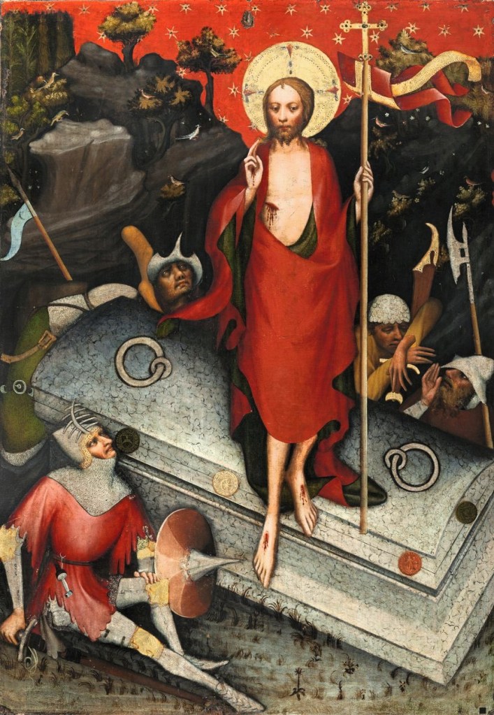 Der „Meister des Trebon-Altars“ („Altar von Wittinghausen“; Böhmen) war um 1380 schon einen Schritt weiter. Es wird uns nicht so sehr erstaunen, dass Christus kraft seiner göttlichen Natur hier den geschlossenen Sarkophag durchbrochen hat. Eher wundern wir uns wohl, dass er in gewohnter Erinnerung an seine menschlichen Eigenschaften vorsichtig beim Heruntersteigen von diesem einen Zwischenschritt über eine niedrigere Stufe macht.10