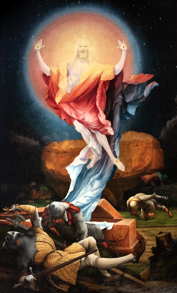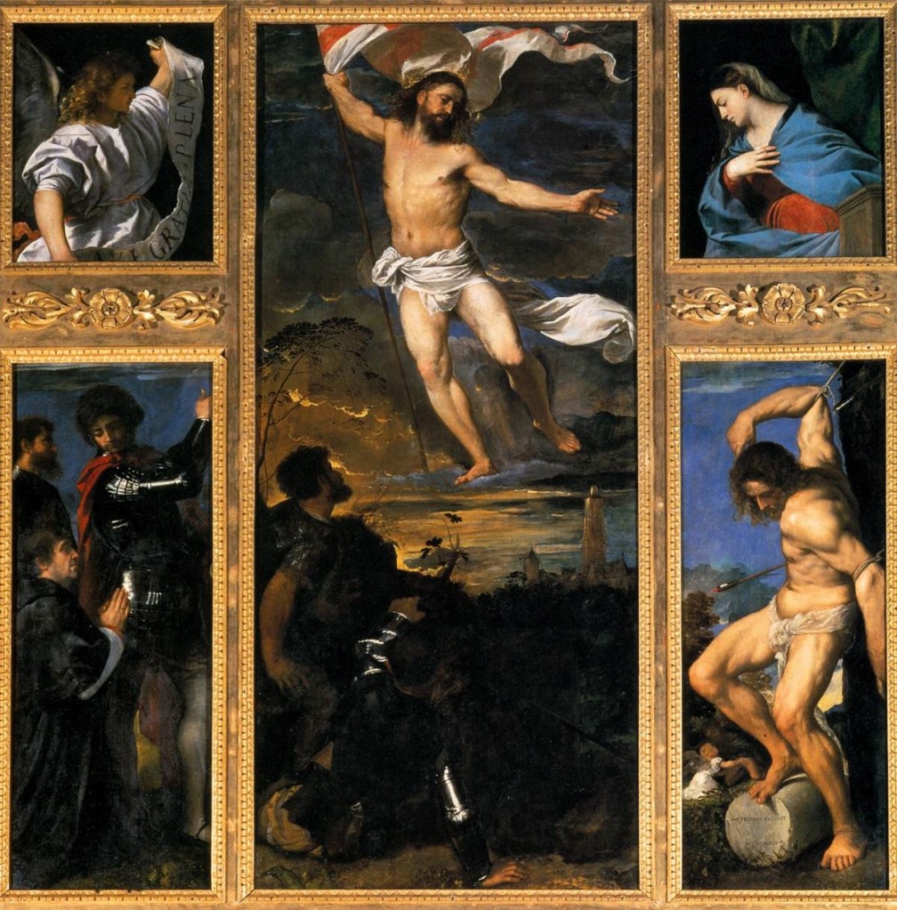 Und tatsächlich, bereits etwa zwei Jahrzehnte zuvor hatte Tizian eine ganz andere Auferstehung erschaffen, voll von überwältigender Dynamik, als Mittelstück des Averoldi-Polyptichons, aufgestellt in der Basilika Santi Nazaro e Celso im norditalienischen Bescia.