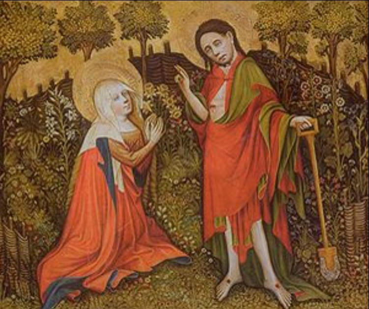 Vielleicht sollten auch wir manches nicht so ernst nehmen und uns eine Pause für einen kleinen Scherz gönnen (auf keinen Fall ist hier irgendetwas blasphemisch gemeint). Mir ist schon klar, dass ein verklärter Körper ganz anderen als unseren Gesetzen in Raum und Zeit unterliegt.3 Selbst in die Stratosphäre würde da ein Ausflug gar nicht lange dauern. Dennoch sollte sich der Auferstandene im klaren sein, dass er sich noch als Gärtner verkleiden und die Standarte gegen Schaufel und Krampen austauschen muss, um im Garten Gethsemane hortikulturelle Arbeiten vorzutäuschen und sich das Vergnügen zu gönnen, dass ihn die Lene, die hl. Maria Magdalena selbstverständlich (so viel Zeit muss sein), im ersten Moment optisch nicht erkennen würde und daher haptisch sich Gewissheit verschaffen wollte, was er durch das Verbot der Tuchfühlung ahndete.