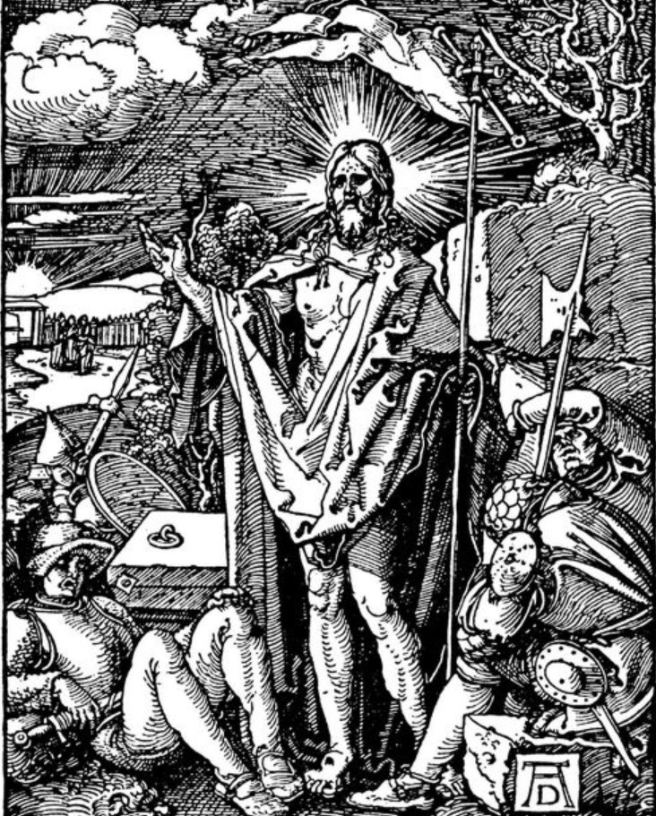 Bei anderen war anscheinend das Bedürfnis vorhanden, beide Komponenten __ die göttliche und die menschliche __ gemeinsam durchscheinen zu lassen. Ich denke an die Bilder, auf denen Christus auf einem mit einem schweren Steindeckel verschlossenen Sarkophag steht. Einen solchen konnte wohl nur ein Gott durchdringen, ohne Spuren zu hinterlassen. Gleichzeitig betonen sie das Menschliche Christi, indem sie ihn mit beiden Beinen auf den Deckel oder sogar fest vor den Steinsarg stellen, wie etwa auch Dürer9 (der allerdings in seinen Werken auch noch andere Varianten der Auferstehung erprobte, bis hin zum schwebenden Corpus).