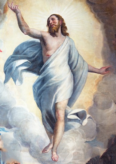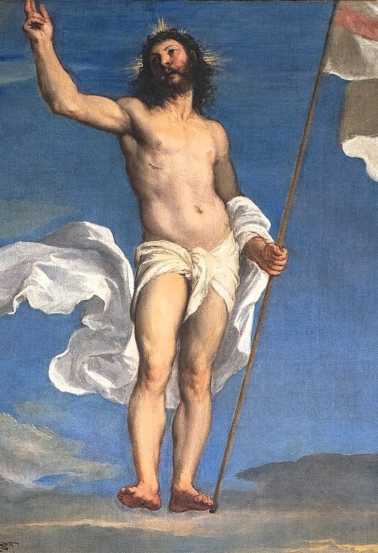 Bei dieser „Himmelfahrt“ (wie auch bei den meisten anderem, etwa jener von Mantegna) blickt Jesus wenigstens mitfühlend auf seine Gemeinde hinunter, die er nun verlassen muss.2 Tizians „Auferstandener“ tut nicht einmal dieses, obwohl hier immerhin zwei schon erwachte Soldaten zu ihm aufblicken.